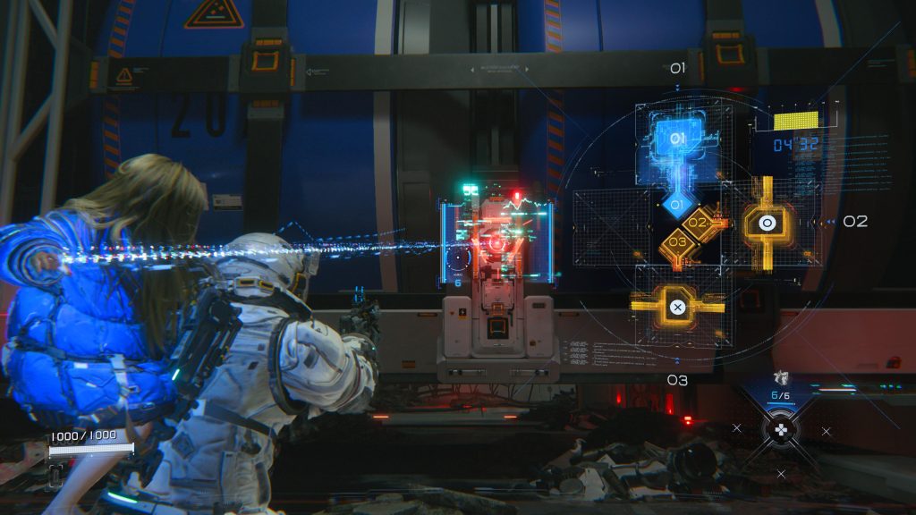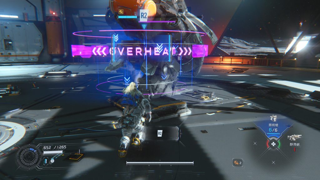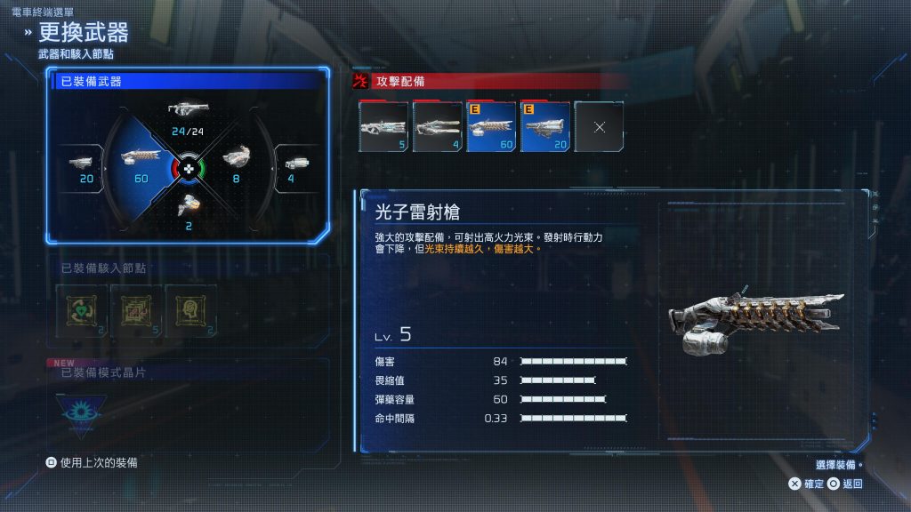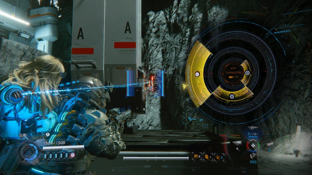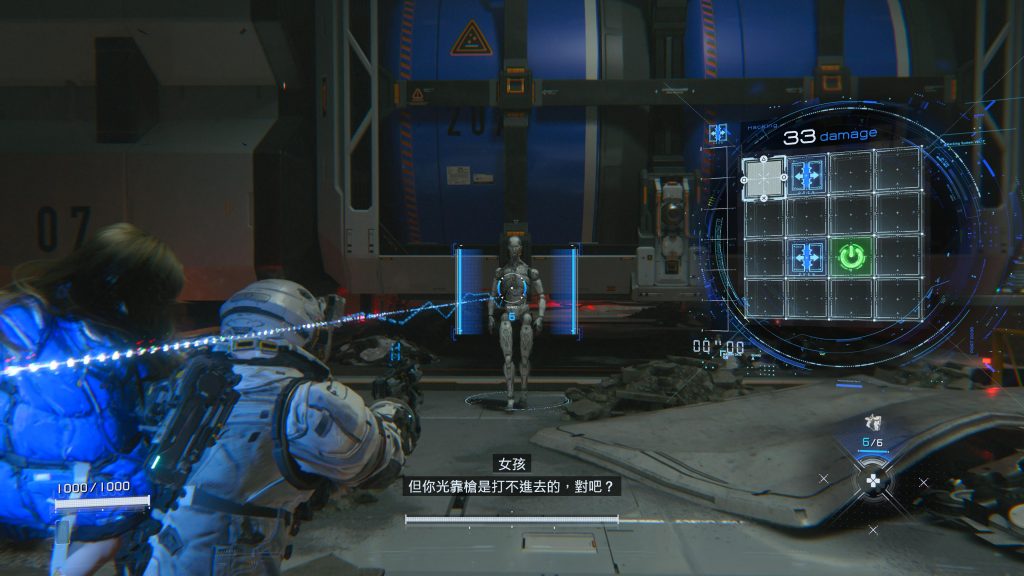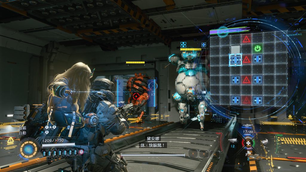 2.駭客系統:畫面右側會出現方格迷宮,你必須用手把右側的四顆按鈕,來控制上下左右去走格子,同時串連不同的效果節點,最後走到終點,就算駭入成功,此時敵人的弱點就會暴露,可以射擊弱點造成大量傷害。