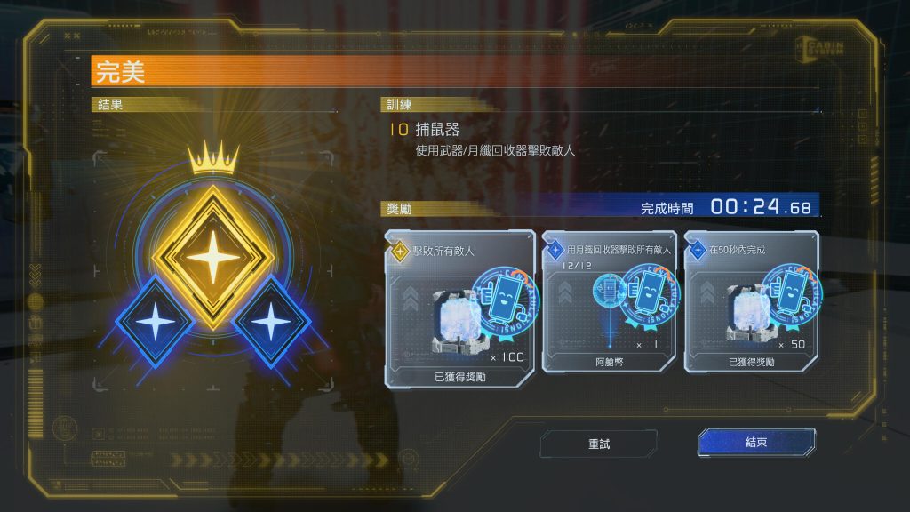 - 裡面有各種訓練可以玩,每一個訓練有三個獎勵條件,可以分別達成,得到三個獎勵。