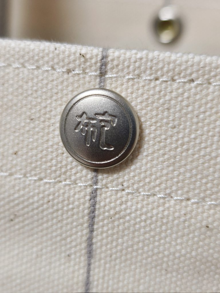 位於正中間的金屬鈕扣有「布包」兩個字