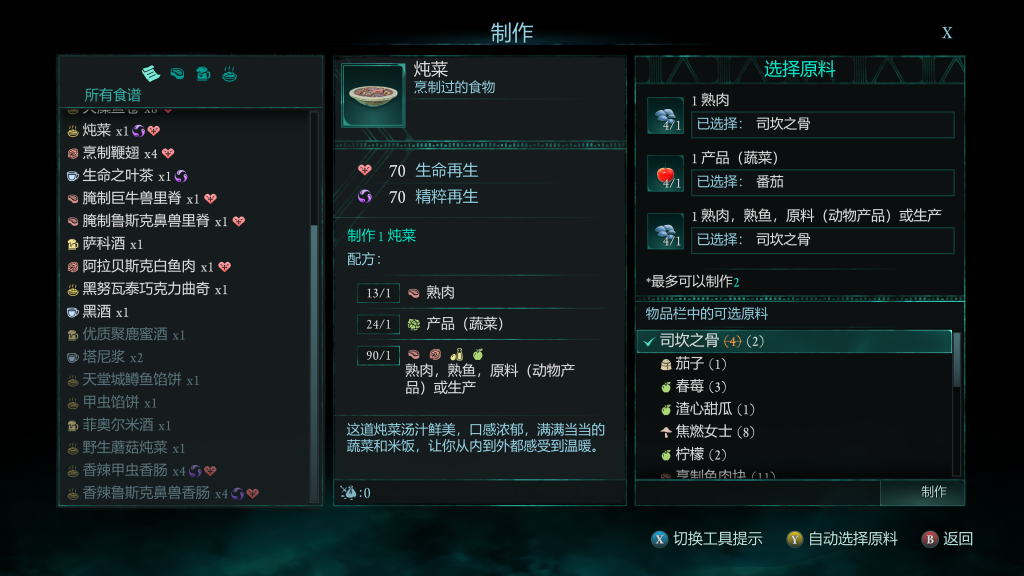 - 想要快速選食物補血時,他會自動幫你建議最適合吃的,不需要你花額外時間去裝備或選取。